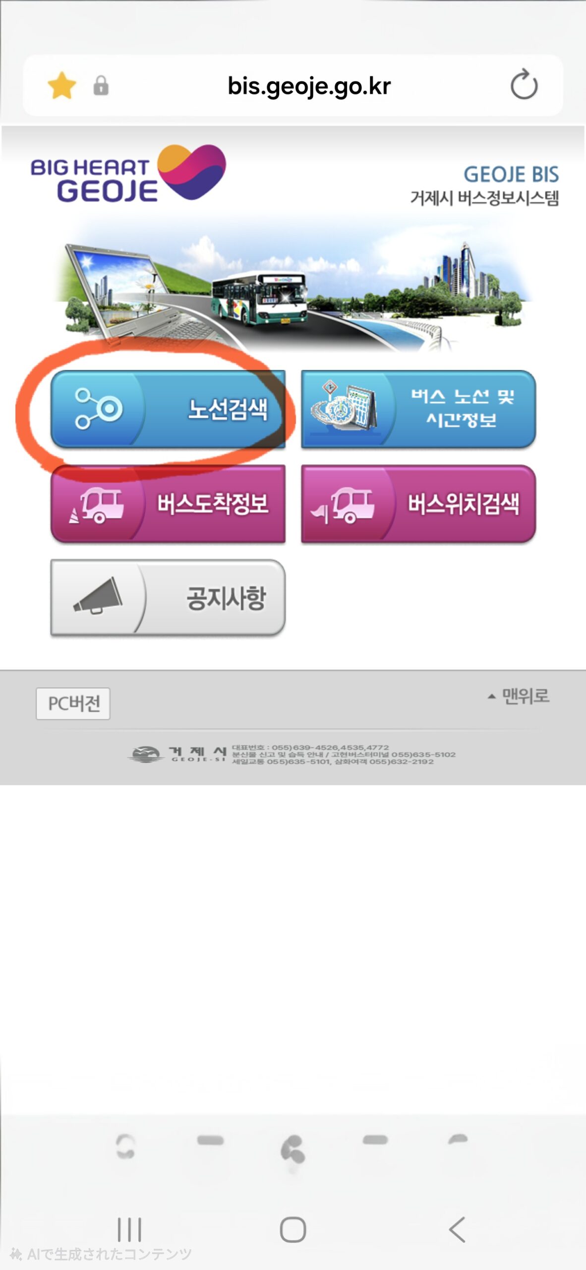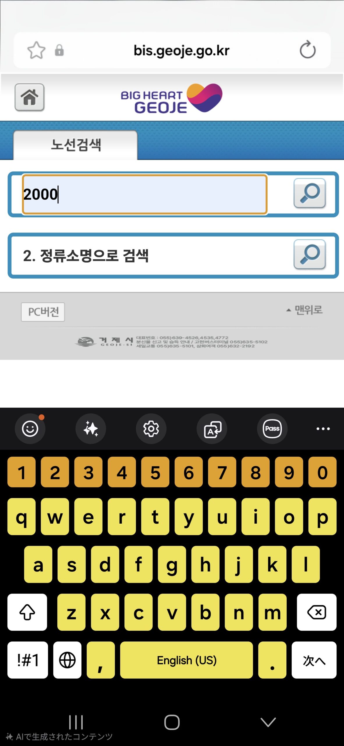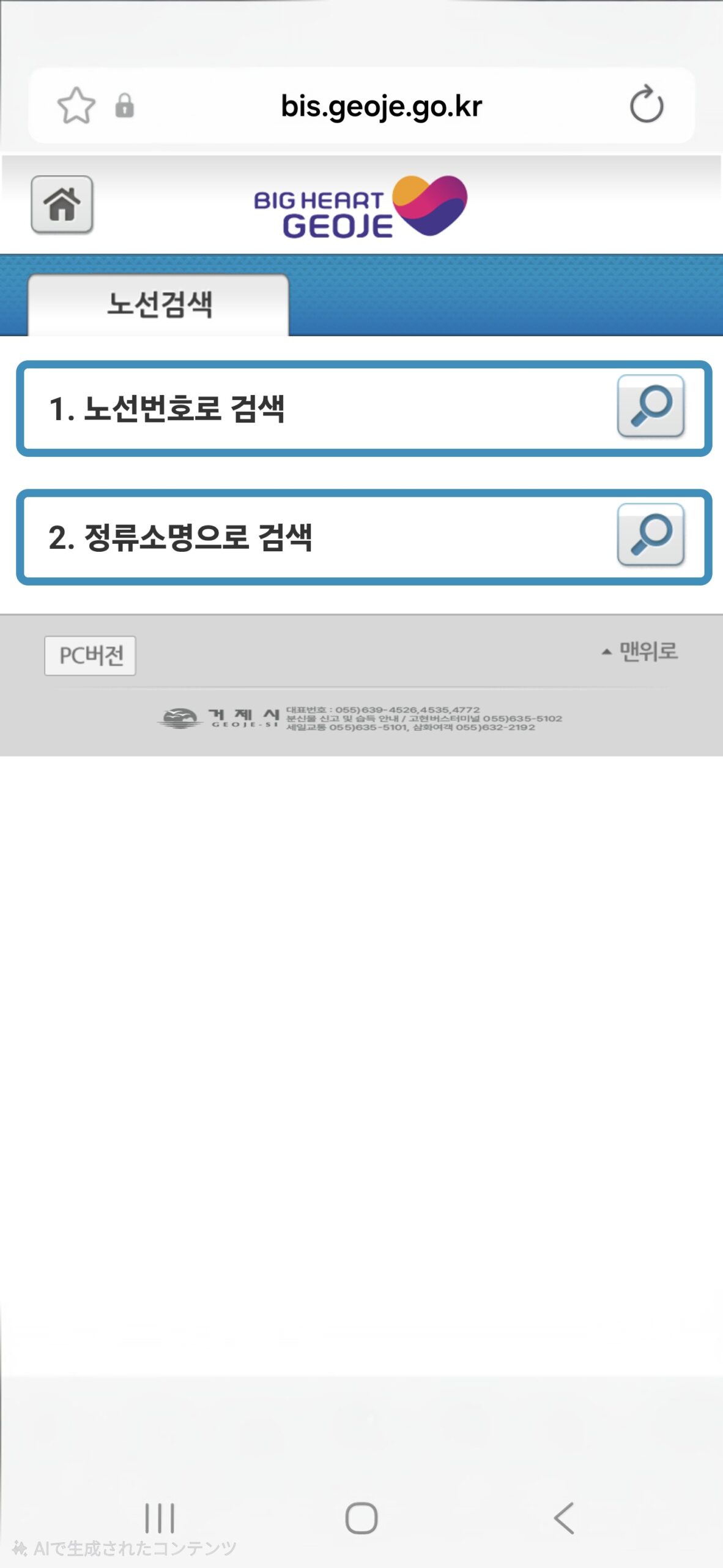 1.노선번호로 검색(路線番号で検索) 2.정류소명으로 검색(停留所名で検索)
